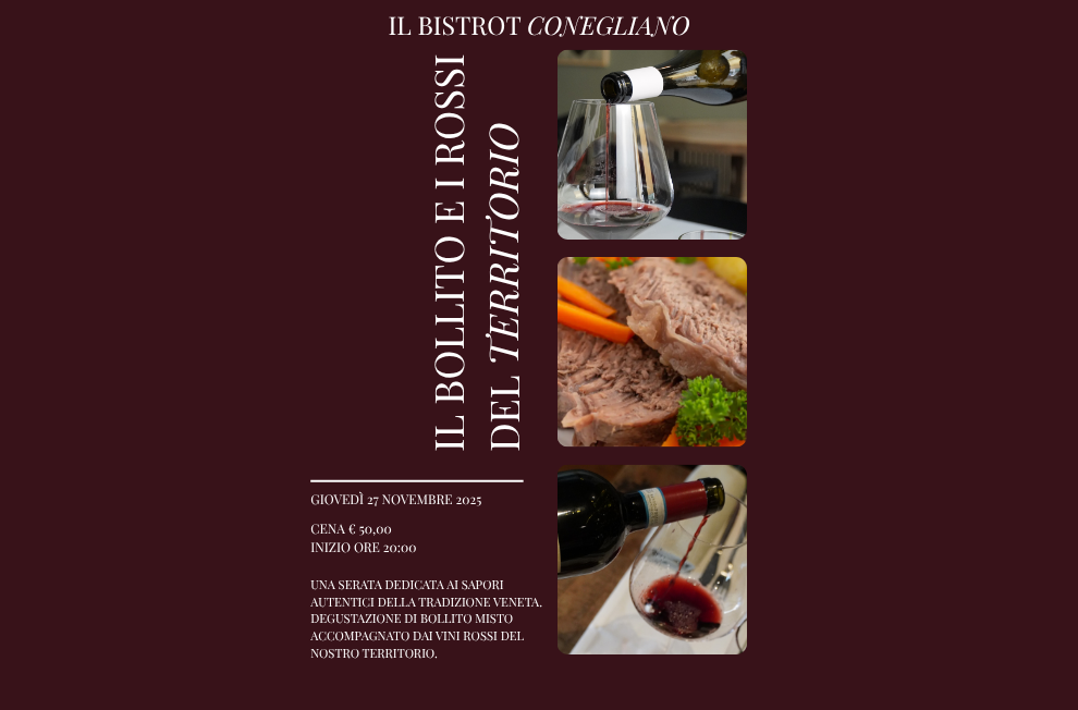 Una serata dedicata ai sapori autentici della tradizione veneta. Degustazione di bollito misto accompagnato dai vini rossi del nostro territorio. Un’esperienza gastronomica pensata per chi ama la cucina autentica, i profumi intensi e la convivialità.